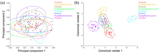 In terms of statistical test parameters (Table S5), the Mahalanobis distance between N. maoershanensis sp. nov. and N. rubens was the smallest, and the Mahalanobis distance between N. minima and N. guangxiensis sp. nov. was the largest, at 14.8569 and 43.7562, respectively, and the difference was extremely significant (p < 0.01). N. guangxiensis sp. nov. and N. maoershanensis sp. nov. had the smallest Procrustes distance, and N. miwai and N.arisana had the largest Procrustes distance, at 0.0189 and 0.0815, respectively.