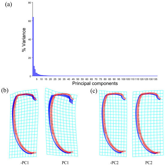 Shape variation trend of elytron in Neotriplax. (a) The proportion of the total variation explained by each principal component based on the contour of the elytron. (b) Variation in the elytron along PC1. (c) Variation in the elytron along PC2.