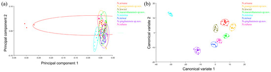 In terms of statistical test parameters (Table S3), the Mahalanobis distance of N. maoershanensis sp. nov. and N. miwai was the smallest, N. miwai and N. minima was the largest, at 6.1333 and 18.2966, respectively, and the difference was extremely significant (p < 0.01). N. qinghaiensis sp. nov. and N. lewisii had the smallest Procrustes distance and N. minima had the largest Procrustes distance, at 0.0206 and 0.0756, respectively, and the difference was extremely significant (p < 0.01).