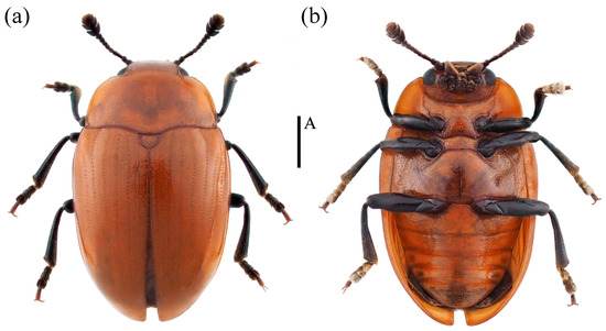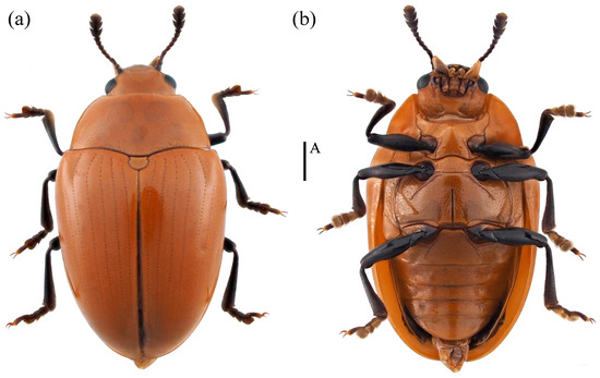 Figure 10. Dorsal and ventral habitus of Neotriplax lewisii Crotch, 1873. (a) Dorsal view; (b) ventral view, scales: 1 mm (A).