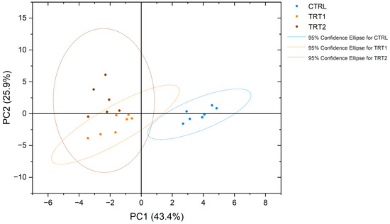 NMR spectroscopy made it possible to obtain a complete view of the free amino acid profiles of the analysed samples. Interestingly, eighteen proteinogenic amino acids and pyroglutamate, an amino acid derivative, were detected and measured. The obtained profiles showed significant differences among the experimental groups (Table 6). From a qualitative point of view, asparagine (Asn) was detected only in the CTRL group and not in TRT1 and TRT2, whereas the opposite trend was observed for pyroglutamate (PyroGlu). Among all groups, the most abundant free amino acids in T. molitor were proline (Pro), arginine (Arg) and tyrosine (Tyr). In contrast, methionine (Met) was the least abundant amino acid in all groups. Significative quantitative differences (p < 0.0001) were observed for arginine, glutamine, and histidine content, which was higher in the CTRL group, and glycine was mainly abundant in TRT1. The PCA plot showed a separate clustering for chestnut-supplemented larvae meals compared to CTRL in terms of the free amino acid profile (Figure 4).