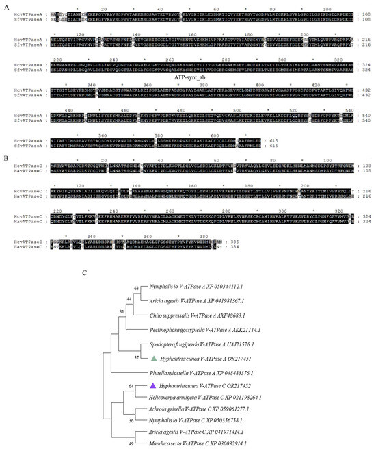 Multiple sequence alignment and sequence homology analyses were performed using NCBI BLASTp and ClustalX 2.0, respectively. Phylogenetic analysis of the V-ATPase subunits A and C, using sequences from different insects, was carried out with the neighbor-joining method in MEGA11. Molecular weight (MW) and isoelectric point [19] predictions were made using DNAMAN.
