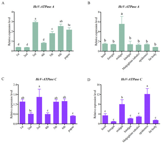 The expression patterns of HcV-ATPase A and C in different tissues and developmental stages. (A,C) The mRNA expression levels at different developmental stages on different days. (B,D) The mRNA expression levels in different tissues, with β-actin used as reference. The data are presented as mean ± S.D. of three independent biological replicates. As part of a one-way analysis of variance, significant differences between groups were determined by the Tukey’s test. The different letters (a–c) at the top of the bar graph represent the significant differences (n = 3) between different tissues and different developmental stages (p < 0.05).