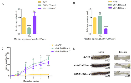 The effect of RNAi on H. cunea larvae and the expression levels of HcV-ATPase A and C. (A,B) The RT-qPCR method was used to detect the silencing efficiency of dsHcV-ATPase A and dsHcv-ATPase C. The transcription level of all target genes was normalized by the expression of the β-actin gene. (C) The survival rate of H. cunea after the injection of dsHcV-ATPase A or dsHcV-ATPase C. (D) The abnormal performance of H. cunea treated with dsHcV-ATPase A and dsHcV-ATPase C was compared with that of dsGFP. The third-instar larvae were treated with double-stranded RNA (dsRNA). The error line represents the standard deviation. The asterisk on the column indicates the significant difference between the control group and the dsRNA treatment group (* p > 0.05, ** p > 0.01, *** p > 0.0001, **** p > 0.00001). The data are expressed as the average of three biological replicates. As a part of the one-way ANOVA, Tukey’s test determined significant differences between groups (p < 0.01); ns means no significant difference, while * means significant difference.