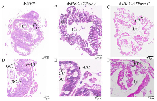 Histology analysis of midguts after injection with dsRNA-GFP/-HcV-ATPase A/-HcV-ATPase C.The third-instar larvae had ingested dsRNA-GFP (A,D), -HcV-ATPase A (B,E), and -HcV-ATPase C (C,F) for 3 days, shown by H&E staining. EP, epithelial. CC, columnar cell. GC, goblet cell. SC, stem cell. Lu, lumen. Scale bars: 200 μm and 20 μm.