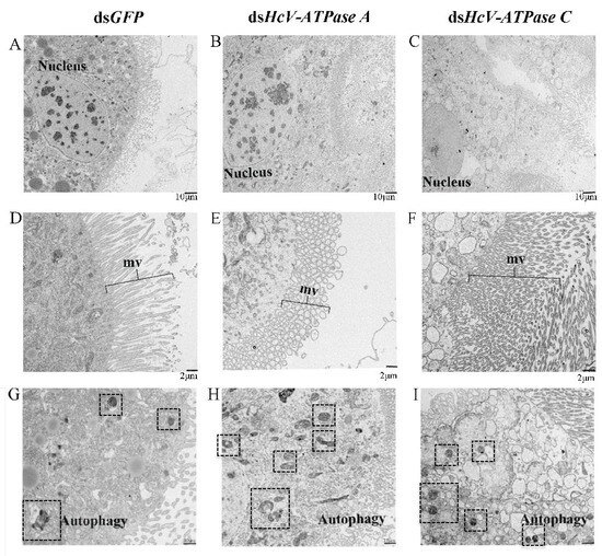 TEM analysis of midguts after injection with dsRNA-GFP/-HcV-ATPase A/-HcV-ATPase C. The third-instar larvae had ingested dsRNA-GFP/-HcV-ATPase A/-HcV-ATPase C for 3 days, shown by TEM. (A,D) dsRNA-GFP. (B,E) dsRNA-HcV-ATPase A. (C,F) dsRNA-HcV-ATPase C. mv, microvillus. Scale bars: 10 μm (A–C,G–I) and 2 μm (D–F).