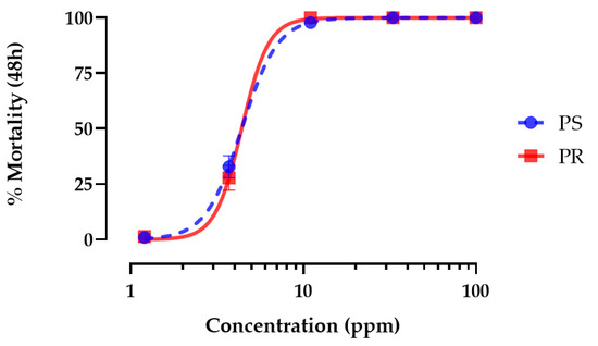 Concentration–response curves for 48 h larvicidal activity of hemp leaf extract against pyrethroid-susceptible (PS, blue) and pyrethroid-resistant (PR, red) Ae. aegypti. Values plotted are means ± standard errors of the mean (SEM) based on 28 replicates of 6 larvae per concentration (1.2, 3.7, 11, 33, 100 ppm).