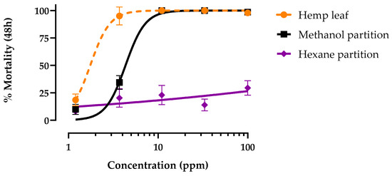 Concentration–response curves for 48 h larvicidal activity of methanol (black) and hexane (purple) partitions of hemp leaf extract (orange) against pyrethroid-susceptible Ae. aegypti. Values are means ± SEM based on 12 replicates of 6 larvae per concentration (1.2, 3.7, 11, 33, and 100 ppm).