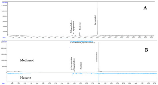 Gas chromatogram of (A) hemp leaf extract and (B) methanol partition (black) with hexane partition (blue) inverted.