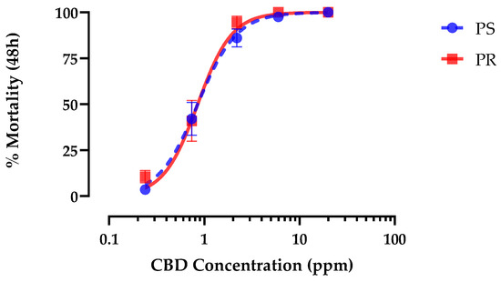 Concentration–response curves for 48 h larvicidal activity of CBD against pyrethroid-susceptible (PS, blue) and pyrethroid-resistant (PR, red) Ae. aegypti. Values are means ± SEM based on 16 replicates of 6 larvae per concentration (0.2, 0.7, 2.2, 6.0, and 20 ppm).