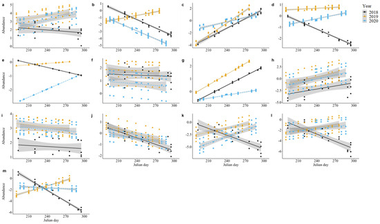 There was no significant effect of either year, Julian day, or their interaction on the abundance of Chloropidae, Crabronidae, or Miridae (0.05 < p < 0.83, Figure 1k–m).