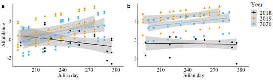 Wasps exhibited a significant interaction effect between year and Julian day on abundance per sampling event (Χ2 = 12.22, p < 0.01, Figure 2a), with a general higher abundance of wasps in late 2019 compared with late 2018.