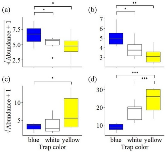 Abundance of guilds per site grouped by date and trap color: (a) bees, (b) butterflies, (c) wasps, and (d) predatory flies (* p < 0.05, ** p < 0.01, *** p < 0.0001).