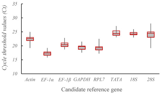The quantity of potential reference genes available is a key factor in the screening process [23]. The sorghum aphid exhibited Ct values between 15.80 and 27.967 for the eight potential reference genes, satisfying the required standards for gene expression as reference genes [12]. The EF-1α gene exhibited the smallest Ct value, suggesting the highest expression level, whereas the TATA gene displayed the largest Ct value, indicating the lowest expression level. Specifically, the expression levels of the EF-1α, EF-1β, GAPDH, and RPL7 genes were higher, whereas the gene expression levels of the Actin, TATA, 28S, and 18S genes were lower. These results demonstrate that the Ct values of the EF-1α, GAPDH, RPL7, and EF-1β genes were smaller than those of Actin and 18S, whereas the Ct values of TATA and 28S were larger (Figure 1).