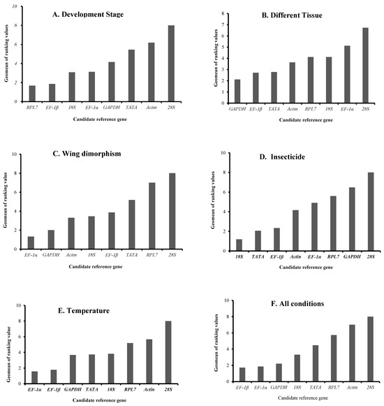 Expression stabilities of the candidate reference genes under different experimental conditions calculated by RefFinder. (A) Different developmental stages. (B) Different tissues. (C) Wing dimorphism. (D) Insecticide treatments. (E) Temperature. (F) Pooled samples. A lower geomean of ranking value indicates more stable expression.