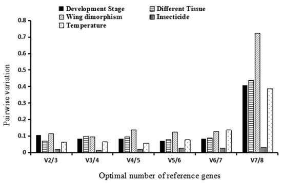 Sorghum aphids treated with imidacloprid were compared with untreated aphids used as a control group. Candidate reference genes for assessing pesticide effects on sorghum aphids were identified. Analysis utilizing ΔCt, NormFinder, and additional software programs indicated that the TATA gene exhibited the greatest stability, whereas BestKeeper and geNorm recognized 18S as the most stable gene (Table 3 and Table 4). Gene stability was ranked by RefFinder in the following order from most stable to least stable as 18S, TATA, EF-1β, Actin, EF-1α, RPL7, GAPDH, and 28S (Figure 2D). Additionally, geNorm analysis underscored the importance of selecting two reference genes for accurate gene expression analysis in studies involving pesticide effects on sorghum aphids (Figure 3).