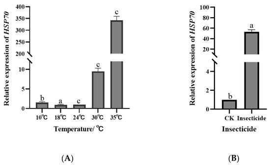 Relative expression levels of an HSP70 target gene calculated using various sets of reference genes. (A) Expressions of HSP70 of sorghum aphid for different temperatures. (B) Expressions of HSP70 of sorghum aphid in insecticide treatment. Different lowercase letters represent differences in expression.