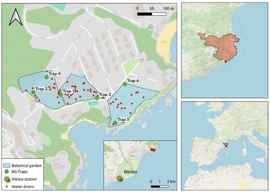 The study was conducted at the Jardí Botanic Marimurtra, a botanical garden located at the city of Blanes, Catalonia, in Northeastern Spain. This garden consists of 4 planted hectares open to visitors. The visitors-accessible space is divided into three distinct gardens, showcasing a diverse array of approximately 4000 plant species from the five continents. Consequently, each garden presents different conditions, including variations in plant composition, watering needs, wind exposure, and orientation. This diversity creates a range of environments that have the potential to influence the prevalence of mosquitoes to varying extents in each area (Figure 1).