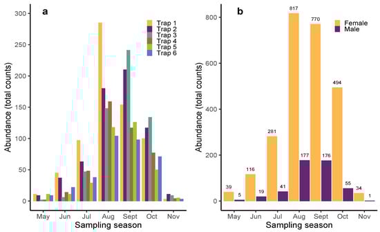 (a) Number of mosquitoes captured by trap and month. (b) Number of mosquitoes captured segregated by sex and month.