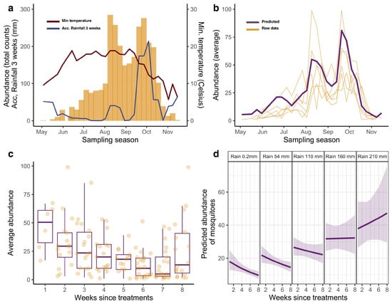 (a) Number of mosquitoes captured during the season (orange bars); red line indicate the minimum temperatures during the sampling season; blue line indicate the accumulated rainfall in the 3 weeks prior to each sampling week. (b) Number of mosquitoes predicted (in purple) with the GLMM model; in light orange, raw data of the number of mosquitoes captured by each trap. (c) Boxplot of average number of mosquitoes captured in the weeks following each treatment intervention. To assess the impact of abundance of treatment interventions, we aggregated count data on traps on a weekly basis, taking the intervention week as the reference week. (d) Interaction effect on predicted mosquito density in the weeks following treatments with increasing amounts of rainfall accumulated in the 3 weeks prior to sampling; at increasing amounts of accumulated rainfall in the 3 weeks prior to sampling, the detrimental effect of larvicide on the predicted number of mosquitoes subsequently captured is attenuated.