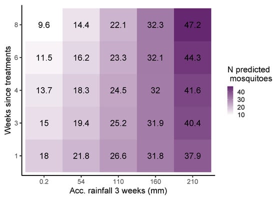 We also observed a strong interaction in the potential efficacy of larvicidal treatments with previous cumulative rainfall values (Figure 3d). Higher values of accumulated rainfall predicted a shorter duration of treatment efficacy over subsequent weeks and a larger number of mosquitoes captured in the traps (Figure 4; for detailed information, see Supplementary Material, Figure S4). Other variables, such as the number of drains with water at the 150 m buffer from each BG-Trap, acting as potential developmental sites and potential sources of adults, also increased the number of mosquitoes. Finally, the presence of visitors at the botanical garden also showed a positive influence on the number of mosquitoes captured in the traps (Table 1). Visitors may promote a positive feedback to mosquito populations by providing blood meals to females, which then lay eggs in nearby water pools. Despite the presence of visitors in the botanical garden being strongly coupled to the seasonal temperature pattern (with a peak in August), the model shows that the positive effect on mosquito numbers is not only directly related to temperature.