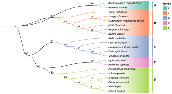 Phylogenetic tree of the Grx5 protein from A. chinensis and other insects. The phylogenetic tree was constructed based on the amino acid sequences of Grx5 using the WAG-based neighbor-joining method with 1000 bootstraps. The families A, B, C, D, and E represent the ptera order of insects. Family B: Hemiptera, and Family A, C, D, E: Lepidoptera.