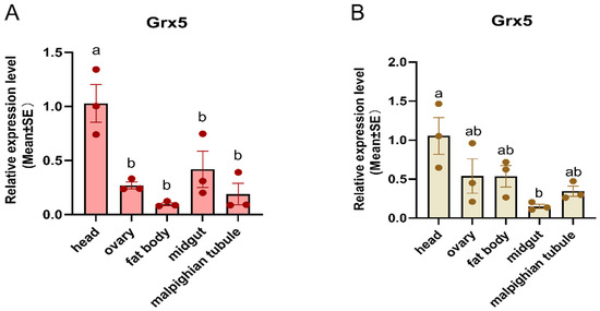 Expression profiles of AcGrx5 in different tissues under non-diapause (A) and diapause conditions (B). The tissue samples included the head, fat body, midgut, malpighian tubule, and ovary of a female adult reared for 10 days under diapause and non-diapause conditions. Data are presented as the mean ± SE of triplicate biological replicates. Statistical differences between different tissues are represented with different letters using a one-way analysis of variance (ANOVA) with Tukey’s multiple comparisons test; p < 0.05.