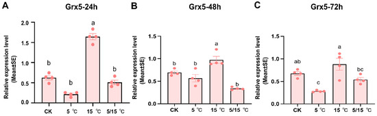 Expression profiles of AcGrx5 at different temperatures at 24 h (A), 48 h (B), and 72 h (C). Data are presented as the mean ± SE of triplicate biological replicates. Statistical differences between different temperatures are represented with different letters using a one-way analysis of variance (ANOVA).