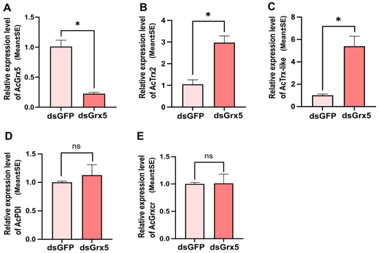 Expression analysis of other antioxidant genes after AcGrx5 silencing. Relative expression of AcGrx5 (A), Trx2 (B), Trx-like (C), PDI (D), and Grxcr (E) (n = 16 for dsGFP, n = 16 for dsGrx5) after injection with dsRNA. Data are presented as the mean ± SE. Asterisk indicates significant differences (t-test; * p < 0.05); ns: no significance. Trx2: thioredoxin 2, Trx-like: Tioredoxin-like, PDI: Protein disulfide isomerases, Grxcr: glutaredoxin domain-containing cysteine-rich protein.