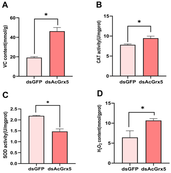 RNAi was used to silence AcGrx5 expression in non-diapausing females. Compared with the control, the VC content was increased by two times (Figure 7A). As shown in Figure 7B, CAT activity increased significantly at 48 h after dsGrx5 injection, while SOD activity decreased significantly (Figure 7C). Similarly, the H2O2 content increased after AcGrx5 knockdown (Figure 7D), suggesting that AcGrx5 was involved in the removal of reactive oxygen species.