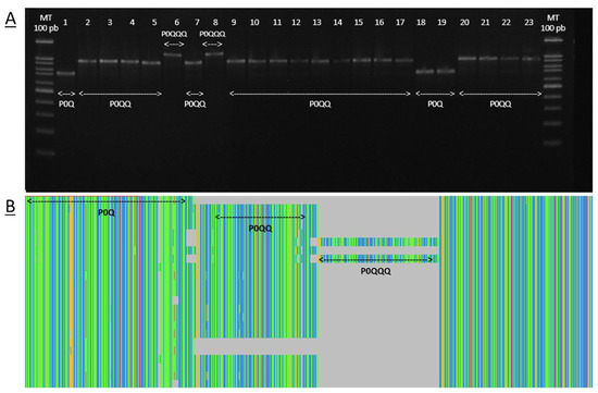 The genetic structure of the COI-COII intergenic region in Algerian samples showed the existence of three polymorphisms: (i) P0Q, (ii) P0QQ, and (iii) P0QQQ (Figure 2), with the P0QQ polymorphism being the most prevalent at 61.8% of occurrences (Table 1).