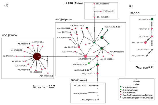 The median-joining network based on the P0Q intergenic structure indicates the presence of four separate groups (Figure 3A). The first group shows sequences of A. m. intermissa and A. m. sahariensis subspecies from Algeria, newly sequenced and previously published, clustering with sequences from the A lineage retrieved from GenBank, corresponding to A. m. intermissa, A. m. sahariensis, and A. m. iberiensis. The second group presents sequences from the SWIO islands and Madagascar that are grouped with published sequences corresponding to the A. m. unicolor subspecies. The third group contains reference sequences from the M lineage, and the fourth group shows sequences corresponding to the African Z sub-lineage subspecies A. m. lamarckii. The median-joining network produced from sequences with the P0QQQ intergenic structure shown in Figure 3B illustrates three groups: (i) the Algerian node represented by the newly described A77′ haplotype (individual ALG_Mascara2_3), (ii) the second group of the Iberian honey bee A. m. iberiensis sequences representing the A lineage; and (iii) the third group indicating sequences from the M lineage.