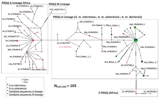 Sequence analysis of the 68 individuals sampled in Algeria revealed 24 haplotypes, including 16 described for the first time and 8 haplotypes previously published [7,31,34,35]. Our results indicate that the most common haplotypes in Algeria are the novel haplotypes A74 (24%) and A1x (10%), followed by the previously described haplotypes A1n (7.3%), A8d, A8f, and A71 (previously Alg5) (6%), respectively. The haplotypes A8d, A71 (Alg5), A1x, and A74 are found to be shared by the two native subspecies in Algeria (Supplementary Table S3).