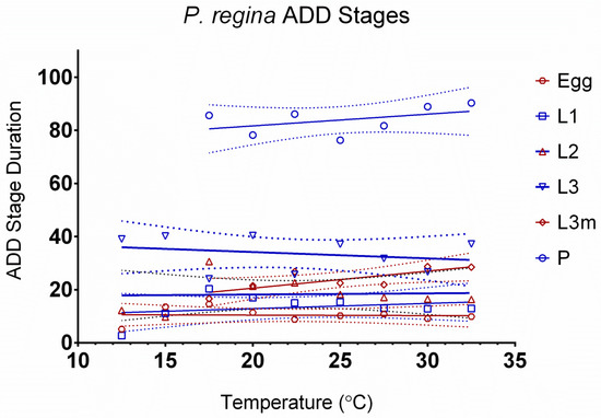 There was no egg eclosion at 7.5 °C and no maturation past L1 at 10.0 °C, so those data are not reported here. However, there is evidence that the biological minimum for P. regina is between 10.0 °C and 12.5 °C, which agrees with development data reported by [13,14].