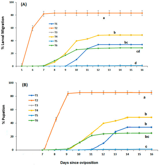 Proportion of C. vicina larvae that had (A) migrated off the dietary media and (B) pupated up to 16 days since oviposition when reared on either: T1 = 100% meatmeal; T2 = 90% meatmeal and 10% whole egg powder; T3 = 100% soya bean meal; T4—90% soya bean meal and 10% whole egg powder; T5 = 100% canola meal; or T6 = 90% canola meal and 10% whole egg powder. The bars indicate the standard error, and the different letters indicate significant differences between larval diets (p ≤ 0.05, Tukey HSD test).