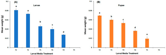 The variances in larval weight (mg) were homogeneous across larval diets (Bartlett’s T = 8.86, p = 0.065), and a one-way ANOVA indicated a significant difference between larval diets (F = 72.48, df = 4,18, p < 0.0001). Mean larval weight was not significantly different (p > 0.05) between meatmeal (T1) and meatmeal with whole egg powder (T2) but was significantly different between all other larval diet treatments (p < 0.05; Figure 2A). The mean larval weight has been graphed from highest to lowest for ease of interpretation and multiple comparison results. The variances in pupal weight (mg) were also homogeneous across larval diets (Bartlett’s T = 1.86, p = 0.761, and a one-way ANOVA indicated a significant difference between larval diet treatments in pupal size (weight in mg; F = 103.05, p < 0.0001). Mean pupal weight was significantly different (p < 0.05) between each larval diet, with the heaviest pupae in T2, followed by T1, T4, T5, and T6 (Figure 2B). Pupal weight has been graphed from highest to lowest for ease of interpretation and multiple comparison results.