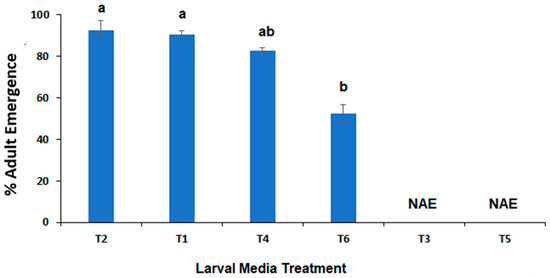 Mean % adult emergence of C. vicina from newly hatched larvae fed a diet of either: 100% meatmeal (T1); 90% meatmeal and 10% whole egg powder (T2); 100% soya bean meal (T3); 90% soya bean meal and 10% whole egg powder (T4); 100% canola meal (T5); or 90% canola meal and 10% whole egg powder (T6). The bars indicate the standard error and the different letters indicate significant differences between treatments (p ≤ 0.05, Tukey HSD test). NAE = No adult emergence.