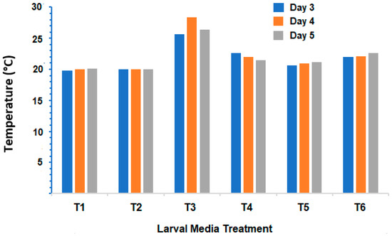 Mean temperature of the larval-rearing media at days 3–5 after placing newly hatched larvae of C. vicina onto a dietary blend of either: T1 = 100% meatmeal; T2 = 90% meatmeal and 10% whole egg powder; T3 = 100% soya bean meal; T4 = 90% soya bean meal and 10% whole egg powder; T5 = 100% canola meal; or T6 = 90% canola meal and 10% whole egg powder.