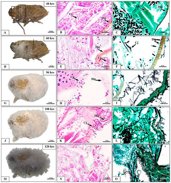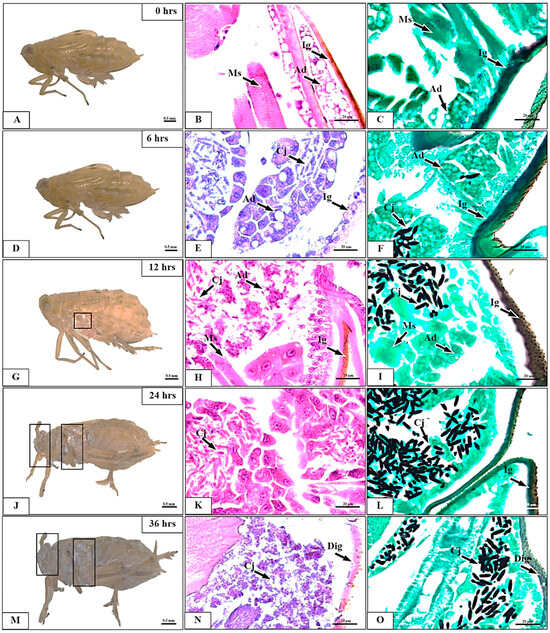 Bunsap, P.; Senarat, S.; Niyomdecha, S.; Pornsuriya, C.; Kaneko, G.; Thaochan, N. Histopathological Alterations in Nilaparvata lugens (Hemiptera: Delphacidae) after Exposure to Cordyceps javanica. Insects 2024, 15, 565. https://doi.org/10.3390/insects15080565