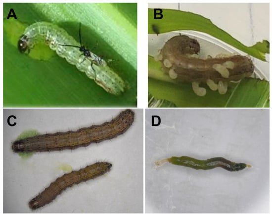 Spodoptera frugiperda larva and its gut. (A) Cotesia ruficrus is parasitizing S. frugiperda; (B) third instar larvae of C. ruficrus crawling out of S. frugiperda larva; (C) S. frugiperda larvae; (D) gut of S. frugiperda larva.