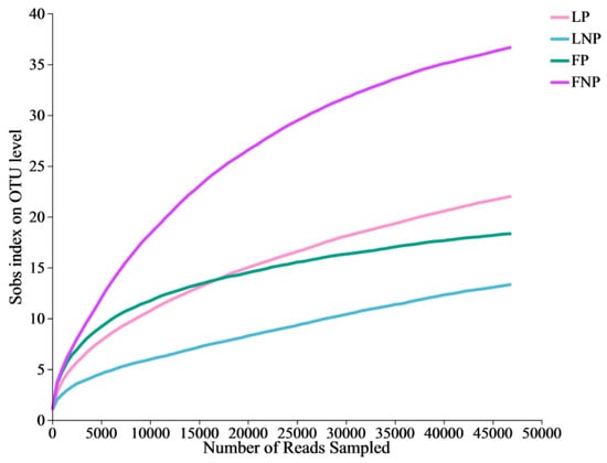 Rarefaction curves of each sample based on Miseq sequencing. The X-axis represents the amount of data randomly selected, and the Y-axis represents the number of species observed. LP represents the long-term laboratory Spodoptera frugiperda parasitized by Cotesia ruficrus. LNP represents the long-term laboratory non-parasitized S. frugiperda. FP represents the short-term laboratory parasitized S. frugiperda. FNP represents the short-term laboratory non-parasitized S. frugiperda.
