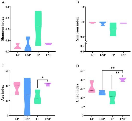 Alpha diversity of gut microbiota in Spodoptera frugiperda. (A) Shannon index; (B) Simpson index; (C) Ace index; and (D) Chao index. The larger the Shannon index value, the higher the community diversity; the larger the Simpson index value, the lower the community diversity; and the larger the Chao and Ace index values, the higher the community richness. LP represents the long-term laboratory S. frugiperda parasitized by Cotesia ruficrus. LNP represents the long-term laboratory non-parasitized S. frugiperda. FP represents the short-term laboratory parasitized S. frugiperda. FNP represents the short-term laboratory non-parasitized S. frugiperda. Data were analyzed by Student’s t-test, values represent the means ± SE. *, ** indicated that there were significant differences between parasitized and non-parasitized S. frugiperda caterpillars at p < 0.05 and p < 0.01, respectively.