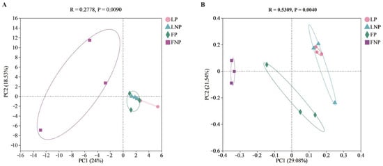 PCA analysis (A) and PCoA analysis (B) of gut bacterial community in Spodoptera frugiperda. LP represents the long-term laboratory Spodoptera frugiperda parasitized by Cotesia ruficrus. LNP represents the long-term laboratory non-parasitized S. frugiperda. FP represents the short-term laboratory parasitized S. frugiperda. FNP represents the short-term laboratory non-parasitized S. frugiperda. Data were analyzed by ANOSIM.