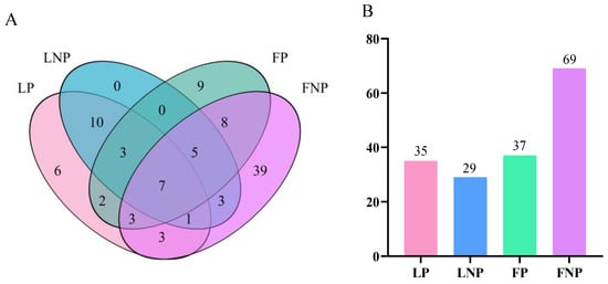 The Venn diagram illustrating the gut bacterial community composition of FAWs revealed specific patterns: LP and FP shared 2 OTUs, LNP and FNP shared 3 OTUs, LP and LNP shared 10 OTUs, and FP and FNP shared 8 OTUs (Figure 5A). Notably, FNP exhibited the highest number of OTUs, with 69 identified, accounting for 69.70% of the total OTUs (Figure 5B).
