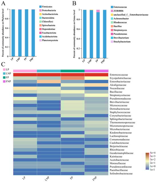 Gut bacterial community dynamics in Spodoptera frugiperda. (A) Phylum level; (B) genus level; and (C) family level. LP represents the long-term laboratory Spodoptera frugiperda parasitized by Cotesia ruficrus. LNP represents the long-term laboratory non-parasitized S. frugiperda. FP represents the short-term laboratory parasitized S. frugiperda. FNP represents the short-term laboratory non-parasitized S. frugiperda.