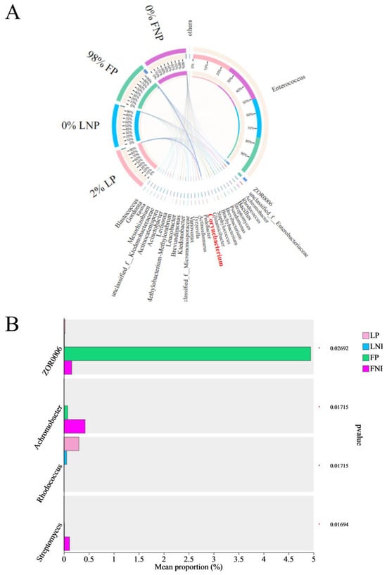 The relative distribution of dominant species within each sample group and the comparative distribution of these dominant species across different groups were visually depicted using a circular graph. Specifically, we represented the abundances of genera with a relative abundance exceeding 30 in the gut bacterial composition of FAWs under LP, LNP, FP, and FNP treatments. Interestingly, our analysis revealed that Corynebacterium was exclusively present in two parasitized FAW caterpillar populations (LP and FP) (Figure 7A). Moreover, ZOR0006, Achromobacter, Rhodococcus, and Streptomyces exhibited significant variations in abundance across the four distinct types of gut bacteria observed in FAWs (Figure 7B).
