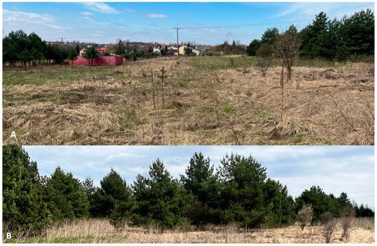 Sites of the occurrence of Dermacentor reticulatus in Sławków, Upper Silesia, central–southern Poland (50°30′19.8′′ N; 19°40′72.6′′ E). (A) Meadow habitat, (B) ecotone habitat.