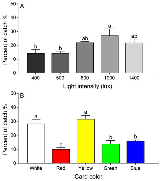Choice tests with T. dendrolimi adults responding to different light intensities (A) and sticky card colors (B). Means with different letters above error bars indicate significant differences among different treatments (Chi-square Goodness-of-fit test, α = 0.05).