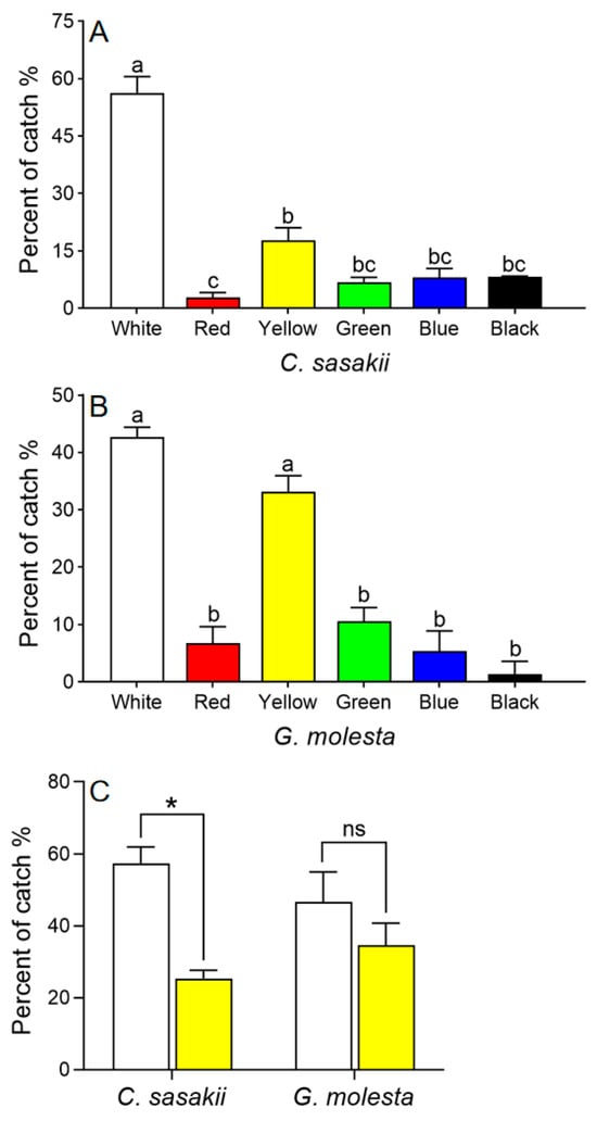 Choice tests with Carposina sasakii (A) and Grapholita molesta (B) adults responding to different colored sticky cards. Means with different letters were significantly different among cards of different colors (Chi-square Goodness-of-fit test, α = 0.05). (C) Choice test with C. sasakii and G. molesta choosing between yellow and white sticky cards (paired t-test (two-tailed), α = 0.05; * represents significant difference between the two colors, ns indicates no significant difference).
