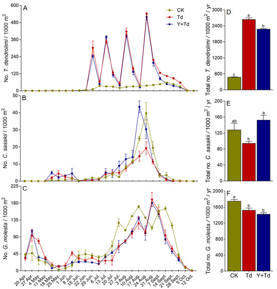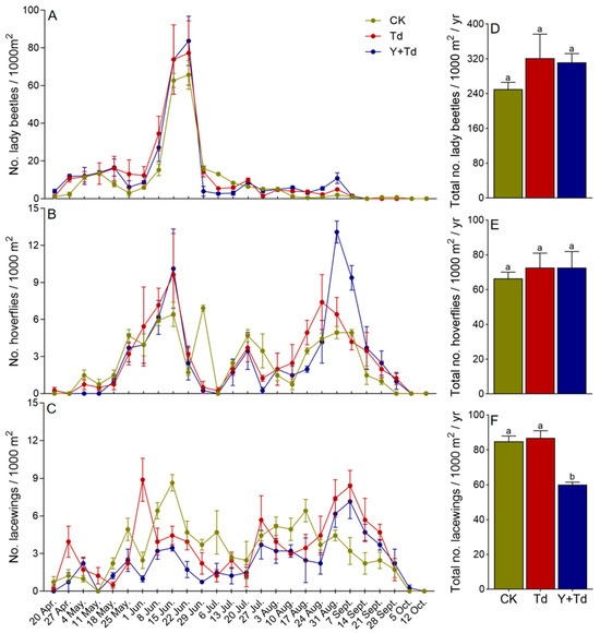 Weekly trap catches (A–C) and cumulative trap catches (D–F) of lady beetles, hoverflies and lacewings in different treatments (CK = control, Td = T. dendrolimi releases, Y + Td = yellow sticky cards + plus T. dendrolimi releases). Means bearing different letters were significantly different among treatments (one-way ANOVA followed by Tukey’s test, α = 0.05).